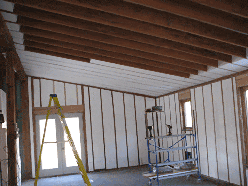 The panels are also used in residential construction with both gable and hip roofs. When a cathedral ceiling is required, EPS panels can be placed between the exposed tongue and groove finished ceiling and the OSB or plywood roof creating a well insulated and tight roof. This application is typically found in contemporary home and log home construction.