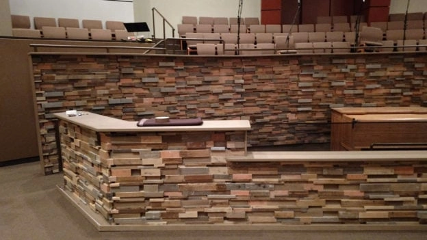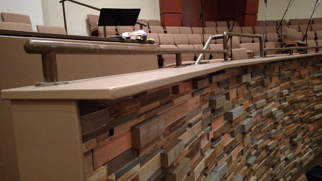 This creative wall finish in Baltimore, MD was produced using 24 sheets of nominal 1 lb density EPS foam and 11 sheets of 3 lb EPS foam sheets. The builder cut the pieces to size, coated them, and glued them to an aluminum panel. The aluminum panel was then attached to the wall and is easily removable if they decide to change the façade.