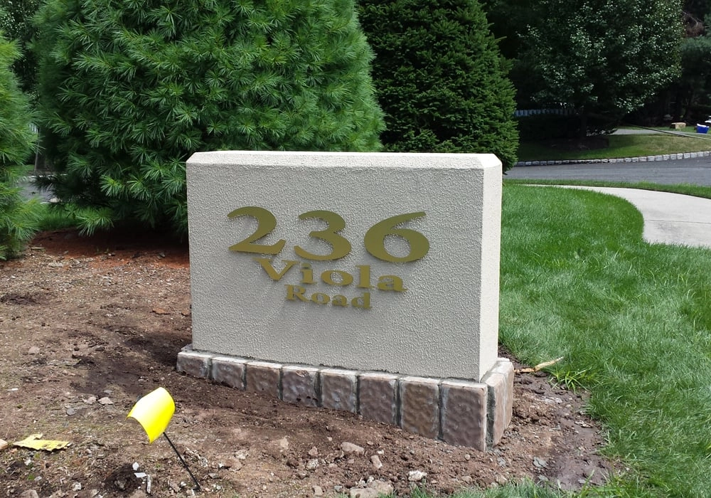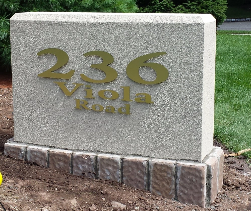 A block of 2 lb density EPS was used to create this distinctive address marker in Central Valley, NY. The top edges of the block were beveled and then coated with an EIFS finish.