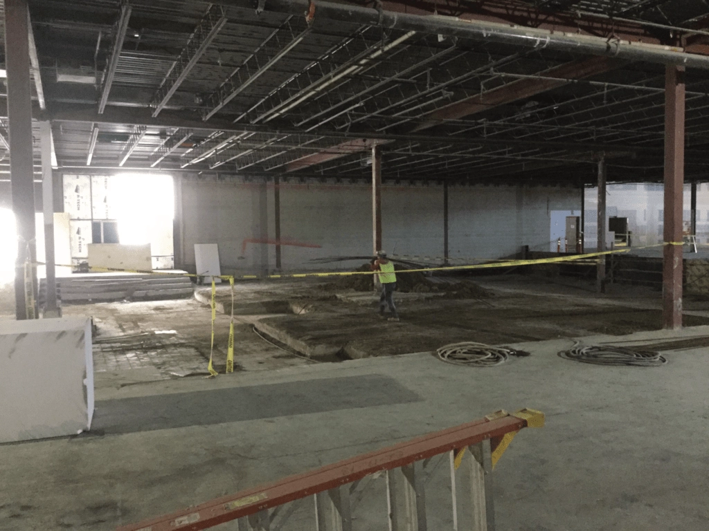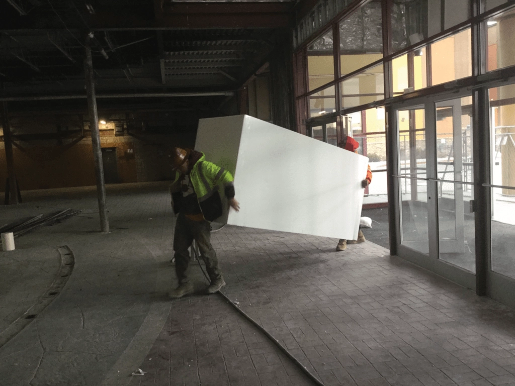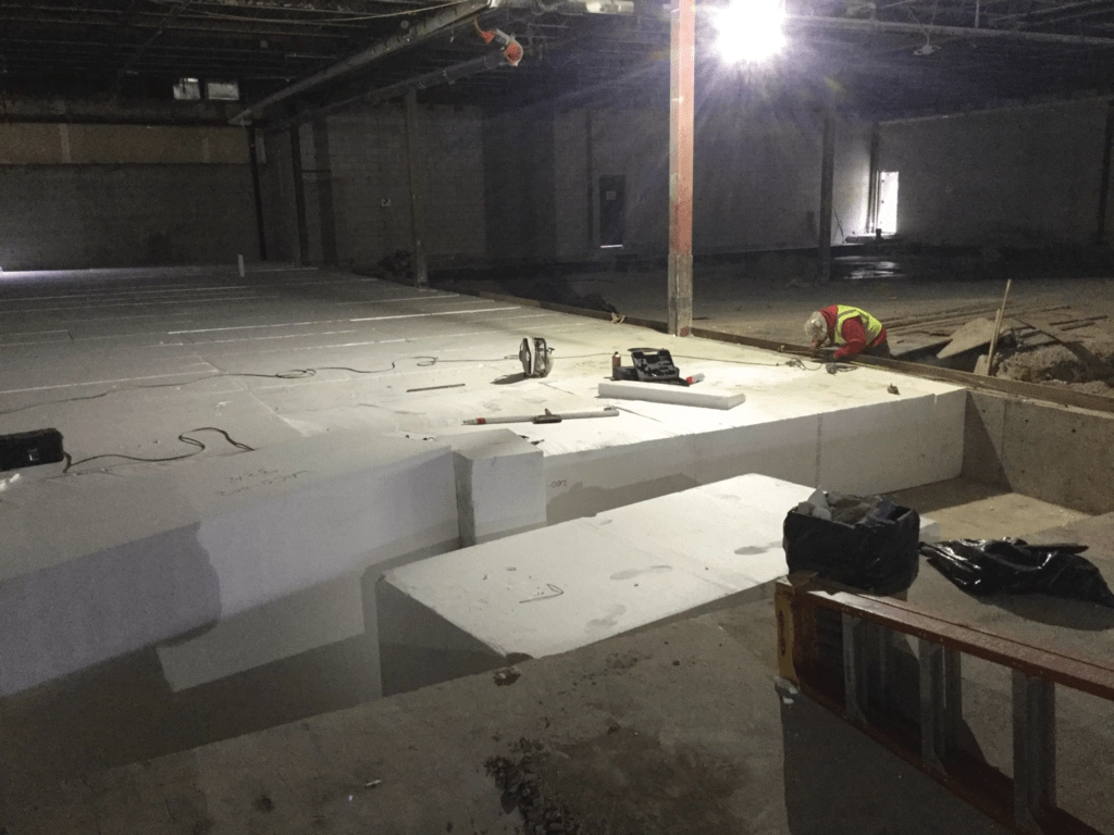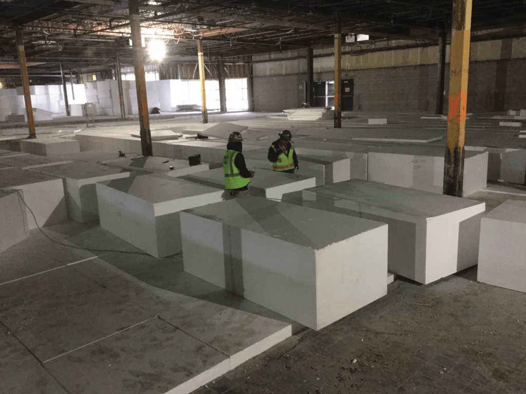 For this tenant fit out at the Valley Fair Mall in West Valley City, UT the existing floor needed to be raised to different elevations ranging from 19” to 40” above the existing slab. The site also required a variety of handicap accessible ramps making the various levels accessible from the entry level elevation. The void fill needed to be light weight so excessive loading was not placed on the existing floor and structure. EPS12 geofoam, weighing just .75 lbs per cubic foot was chosen by the engineer for the fill. EPS12 has a compression strength of 320 lbs per cubic foot at 1% deformation.