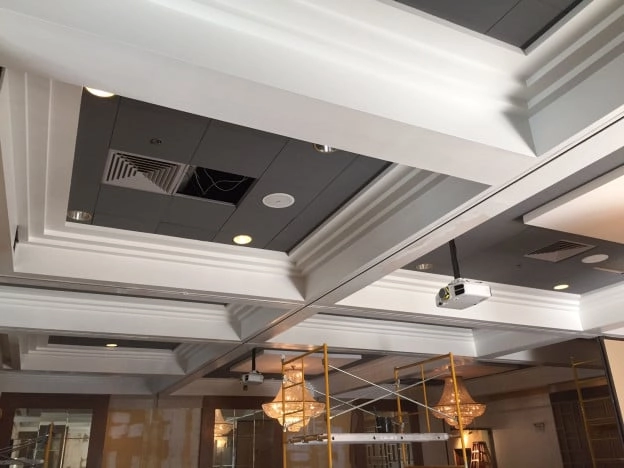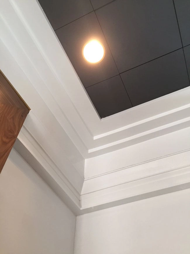 EPS architectural moldings and trim are lightweight and easy to install and finish. These photos show EPS creating a beamed ceiling effect in a Ruth’s Chris Steak House renovation project. The EPS can be precut to shape or fabricated in layers on site. It is typically installed using water based adhesives along with 2 sided tape available from Universal Foam Products. The tape holds the foam in place allowing the adhesive time to set up. The trim is then spackled, sanded and painted. The finished product looks exactly like any high quality wood molding, but at a fraction of the cost. For this project, hundreds of pieces of .9 lb density expanded polystyrene were used in both flat stock as well as precut shapes to create the finished project.
