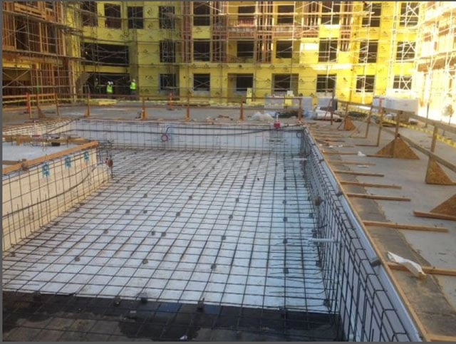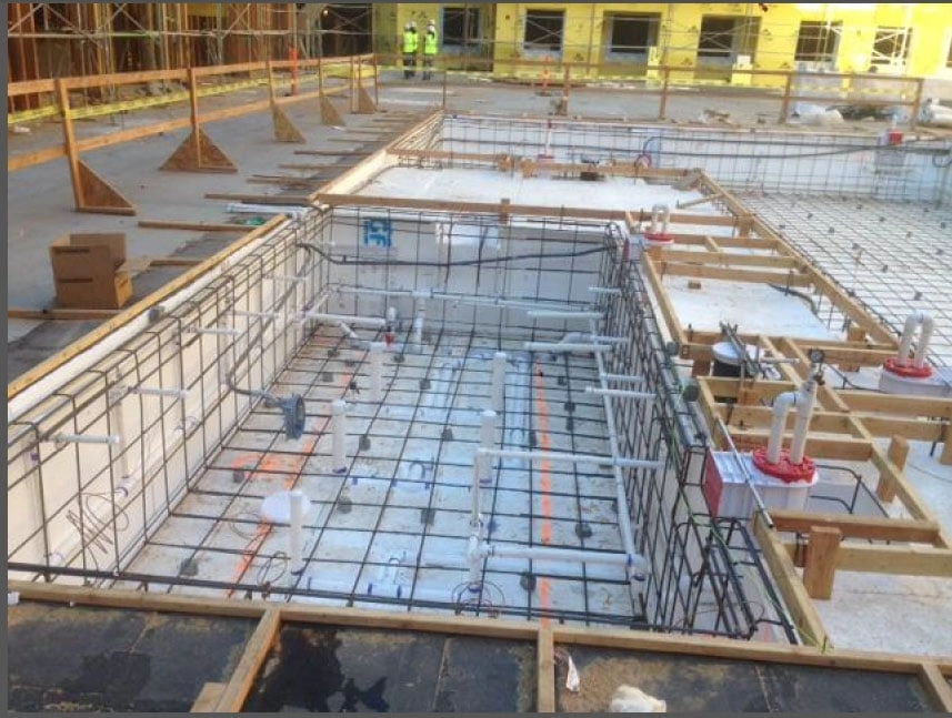 EPS Geofoam is the preferred void fill material for swimming pool construction in new multistory buildings. The geofoam, in flat and tapered panels, is used to create the slope at the bottom of the pool as well as steps and raised platform areas. If the finished pool is going to be smaller than the “tub” first constructed, the EPS Geofoam is also used to fill the spaces to reduce the length and width of the pool. EPS Geofoam has a good compression strength and is 100 times lighter than other fill material such as stone and organic fill. For this pool in Huntington Beach, CA, on the fourth floor of the Huntington Beach Apartments, EPS22 was used.