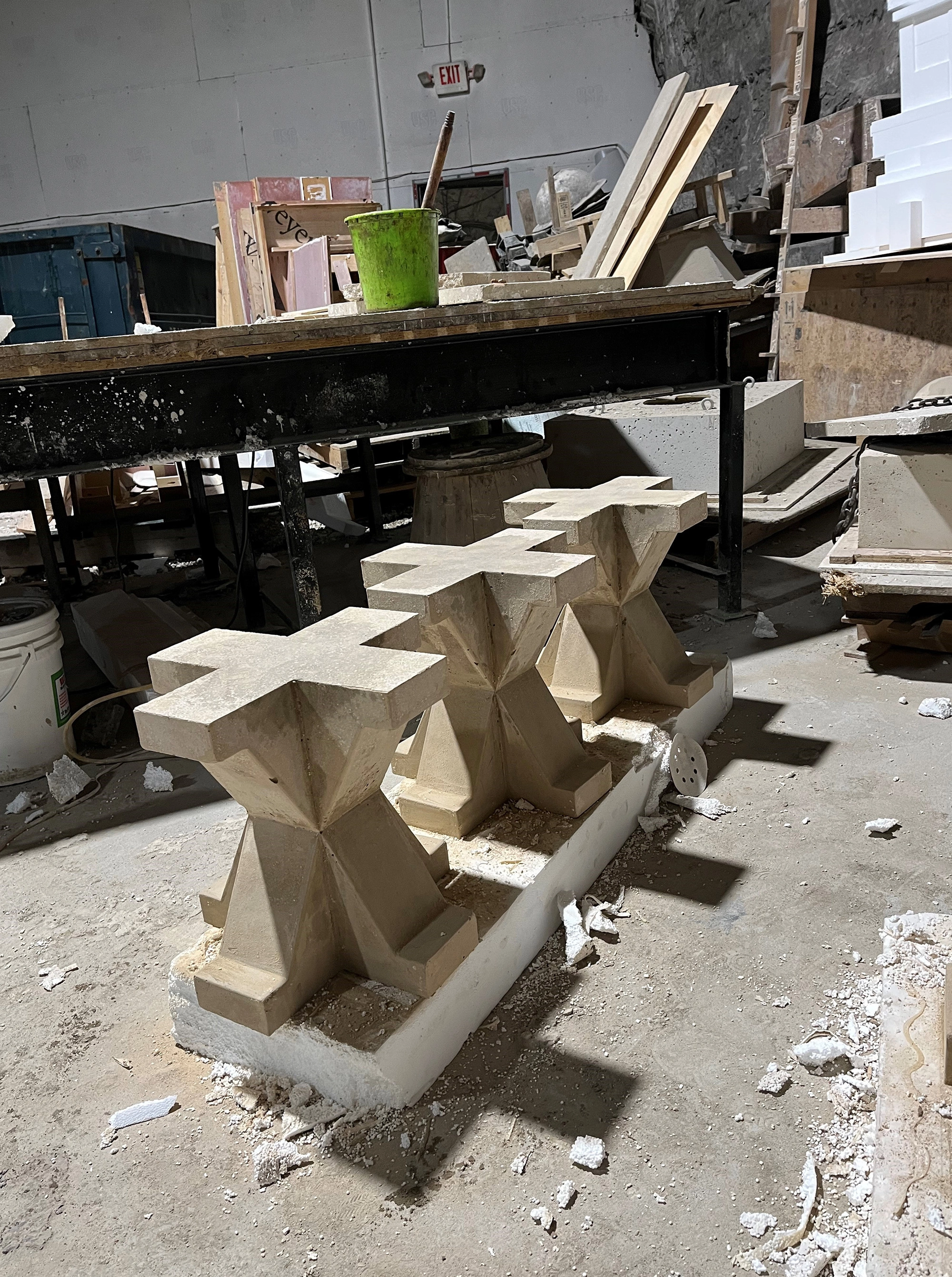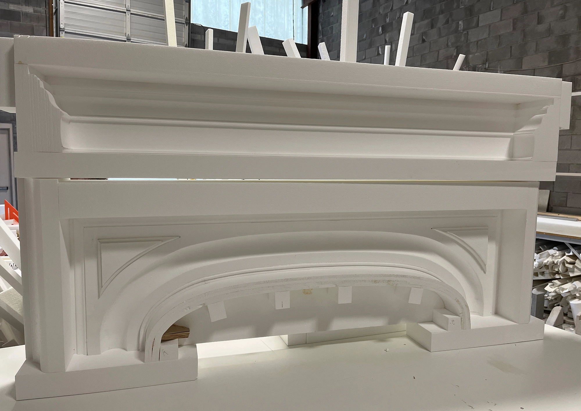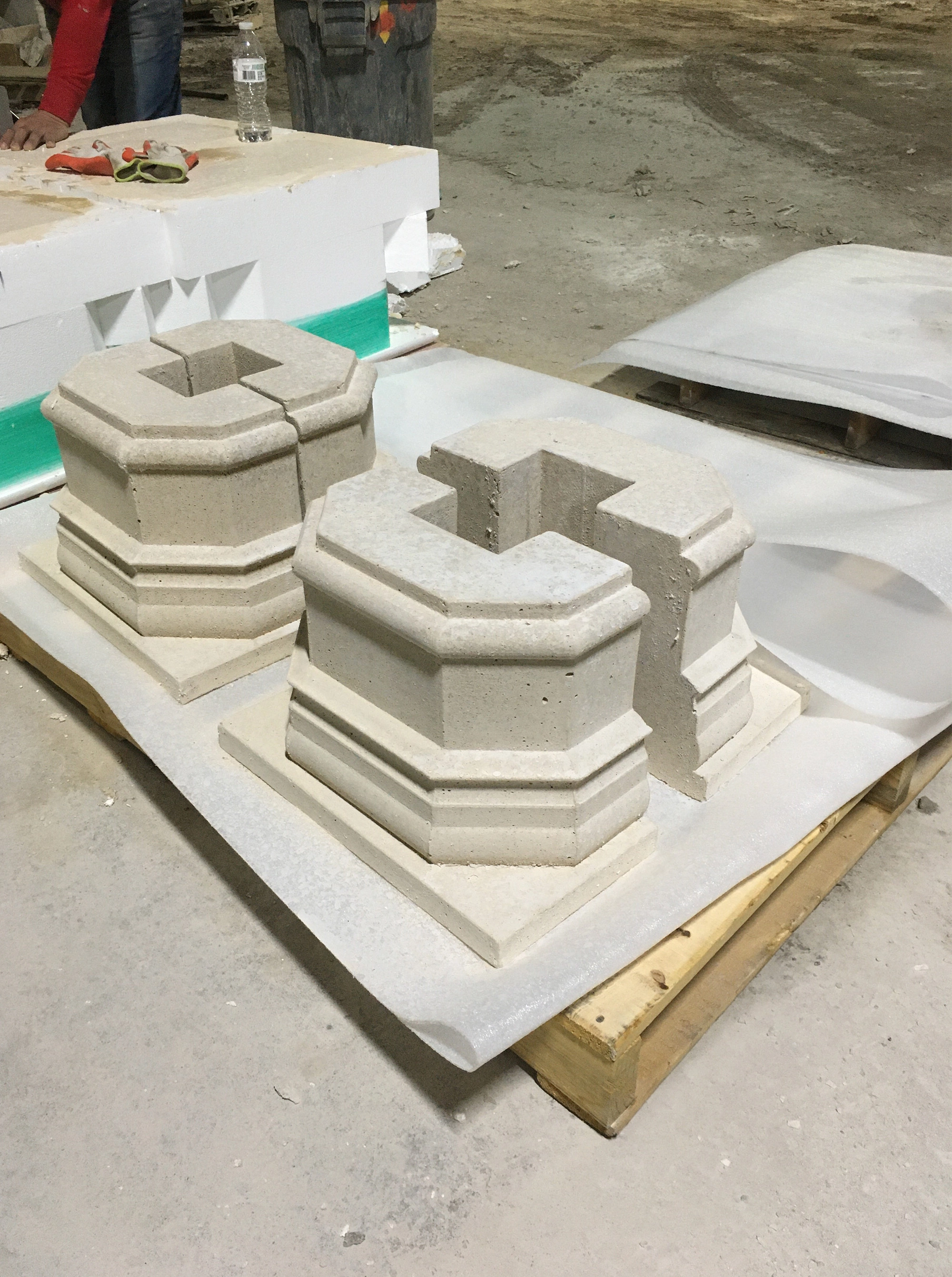 Blocks of EPS Foam are a great source to create concrete forms and molds for cast stonearchitectural elements. With its lightweight and the ability to easily cut and shape the foam, you are able to create these molds for the precast concrete shapes. This company located in Louisville, KY uses all hand operated hot wire cutting tools with addition to fine sandpaper to cut the 1.5 lb Nominal Density EPS Foam blocks. Using precise craftsmanship, the foam pieces are then pieced and glued together before the concrete sand mixture is poured.