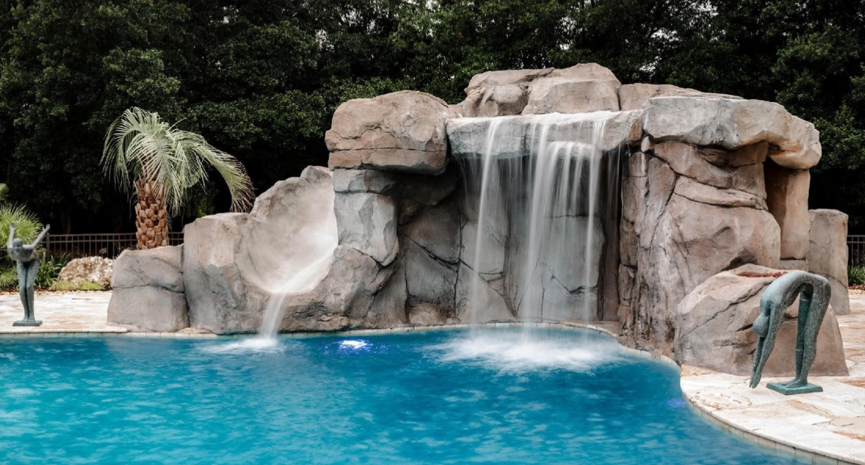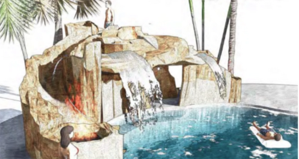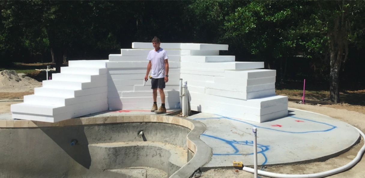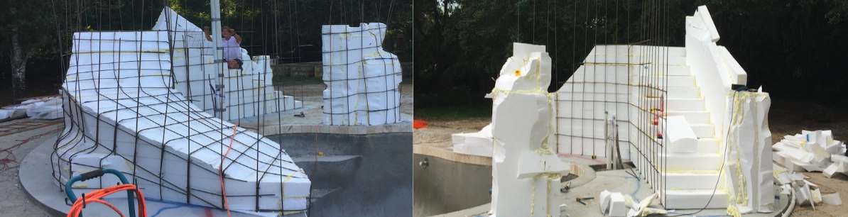 EPS foam and concrete form tubes were installed to create the substructure and void fill for a unique waterfall feature for a residential pool. The foam was then shaped to reflect the underlying form of the grotto, water fall, slide, accent rocks and fire pits.