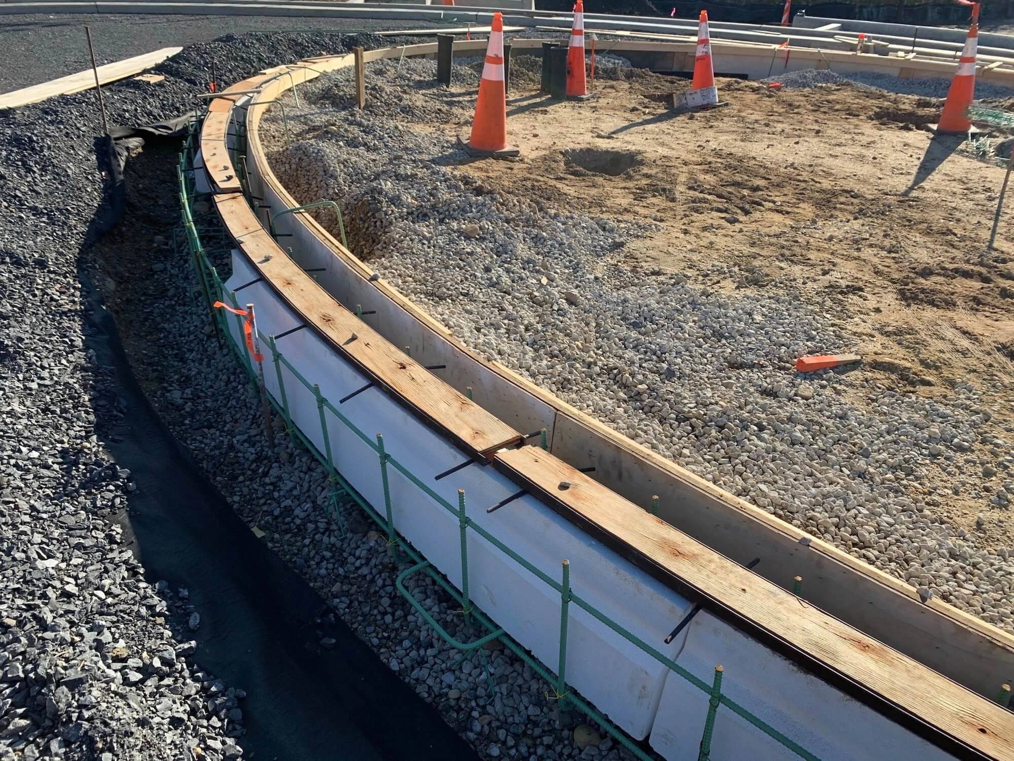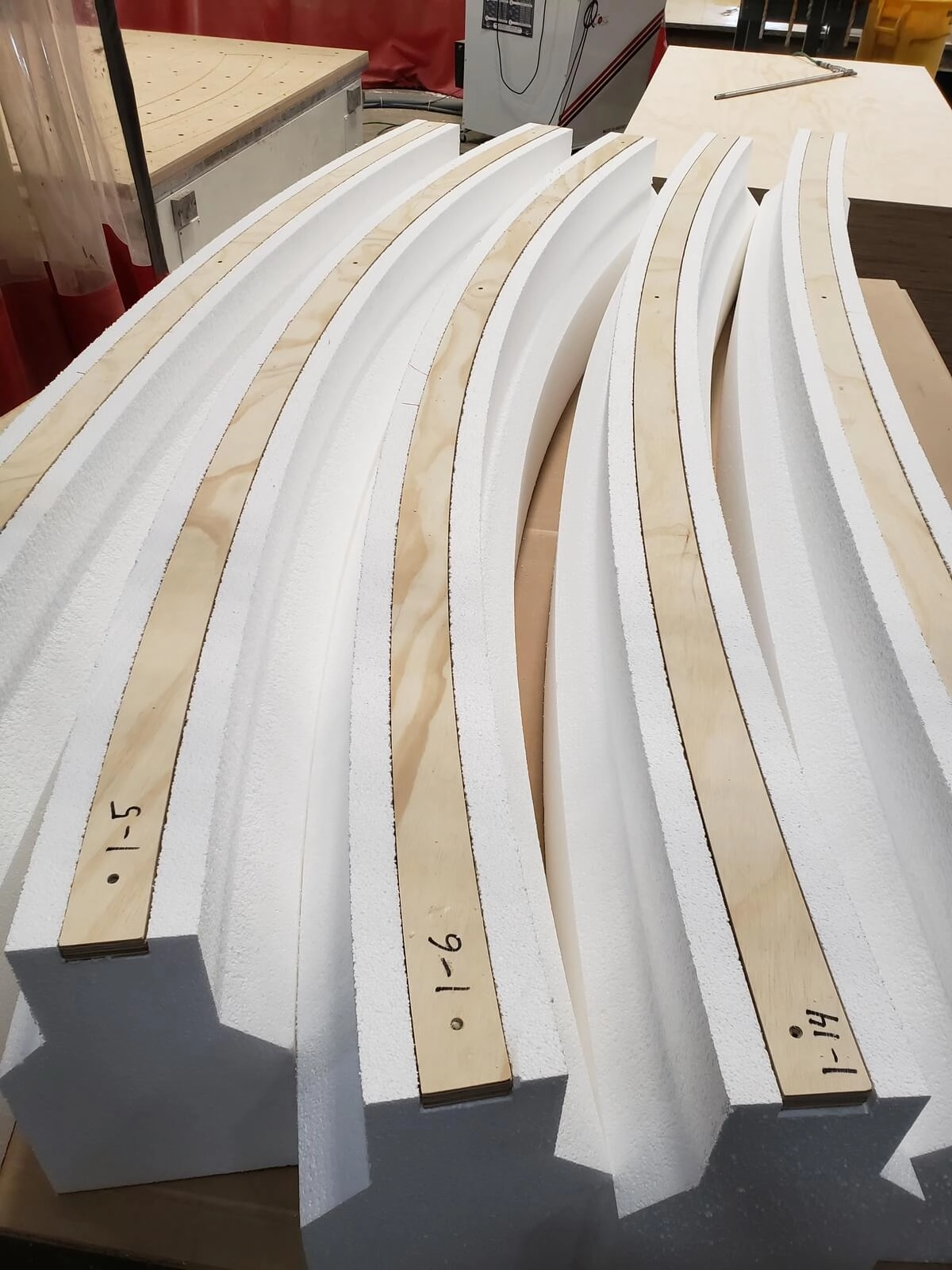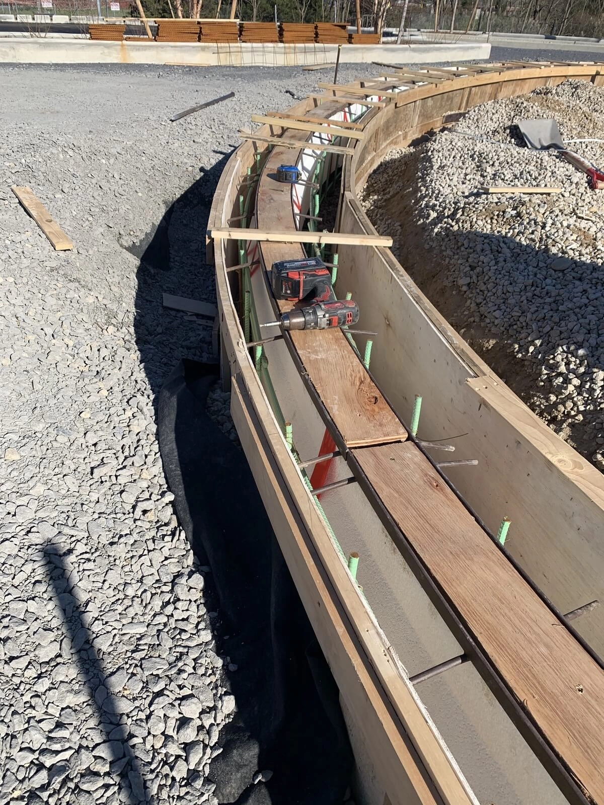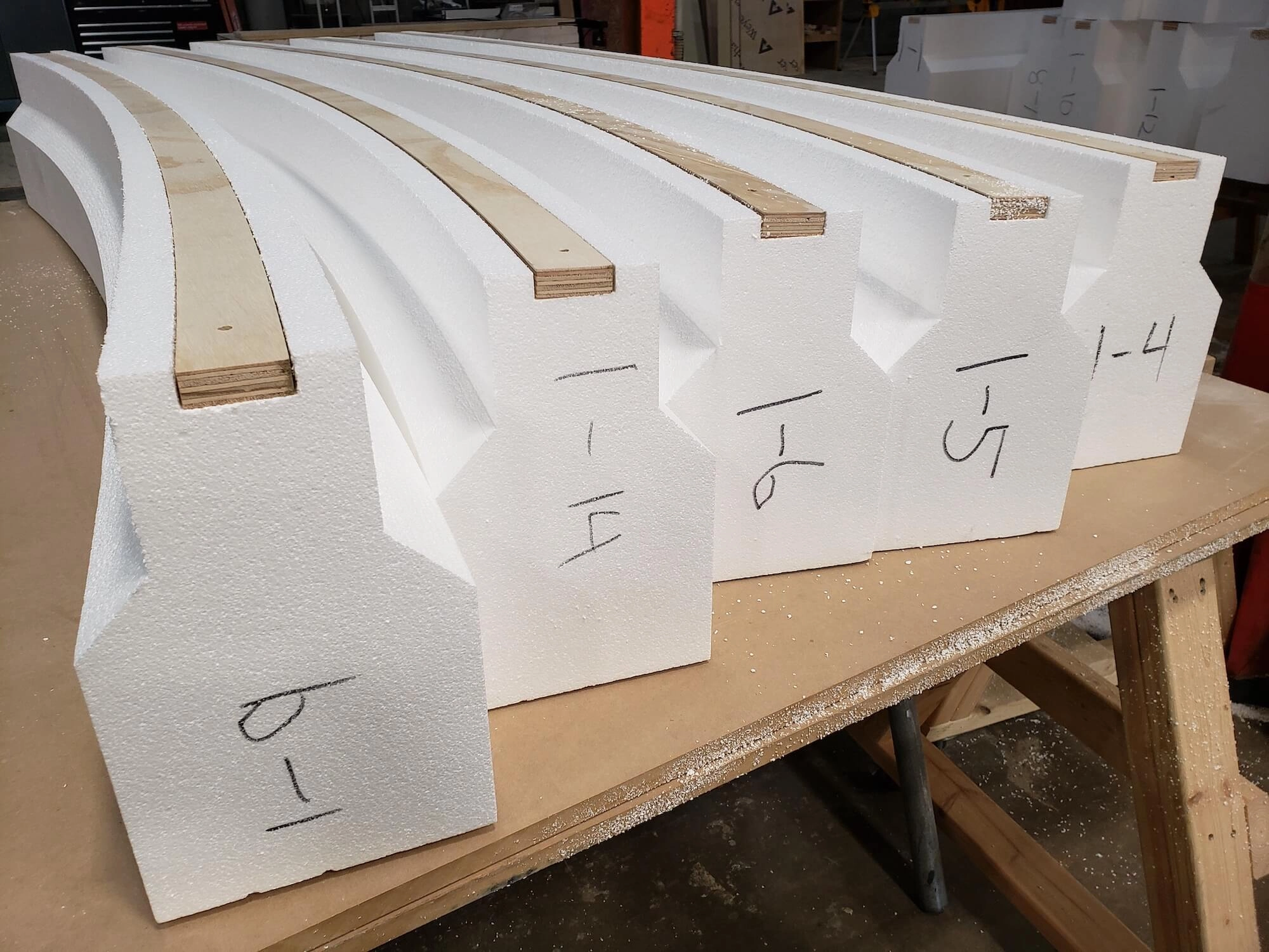 Curved, sloping trench drains can be difficult to form up. For this project in New York, Tiki Industries used custom milled EPS forms with embedded plywood strips to attach to the curved trench drain grates. Each EPS form was labeled to coincide with a drawing of the drain layout provided by the contractor. The grates were attached to the embedded plywood with wood screws. The outer surfaces of the drain were formed using plywood. After the concrete was installed and set up the grates were unscrewed and the plywood and foam removed.
