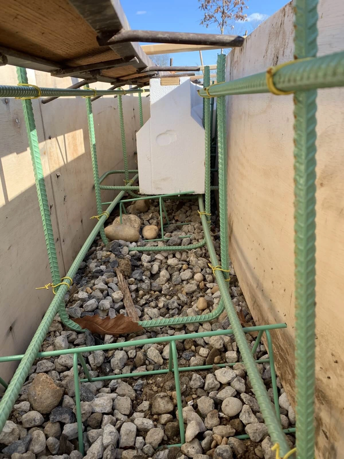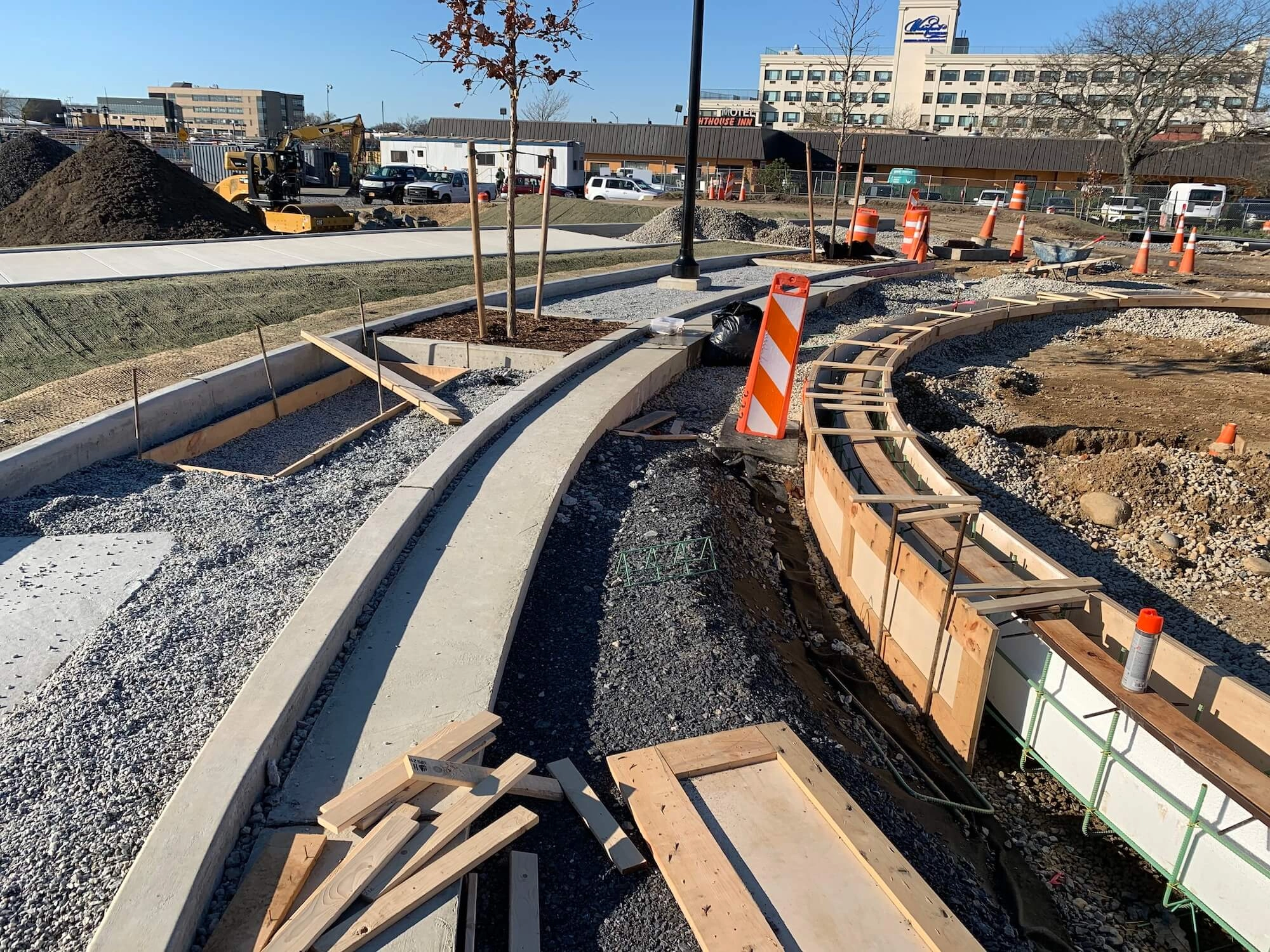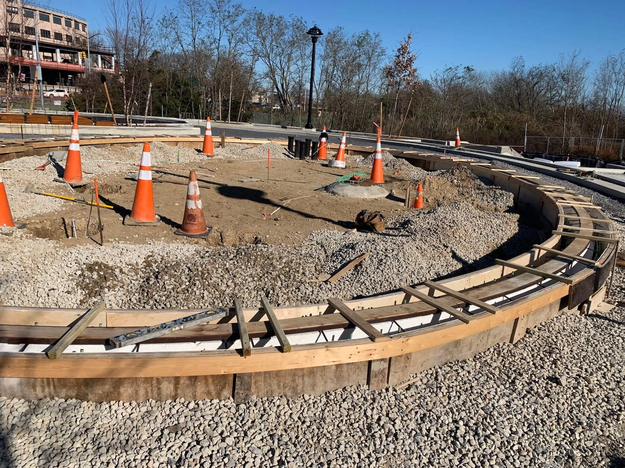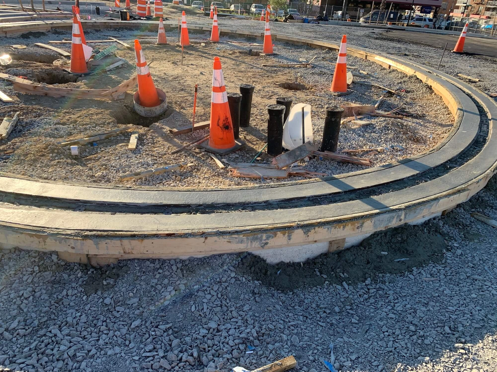 Curved, sloping trench drains can be difficult to form up. For this project in New York, Tiki Industries used custom milled EPS forms with embedded plywood strips to attach to the curved trench drain grates. Each EPS form was labeled to coincide with a drawing of the drain layout provided by the contractor. The grates were attached to the embedded plywood with wood screws. The outer surfaces of the drain were formed using plywood. After the concrete was installed and set up the grates were unscrewed and the plywood and foam removed.