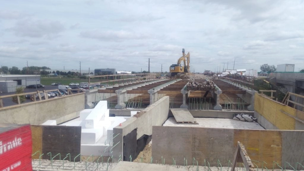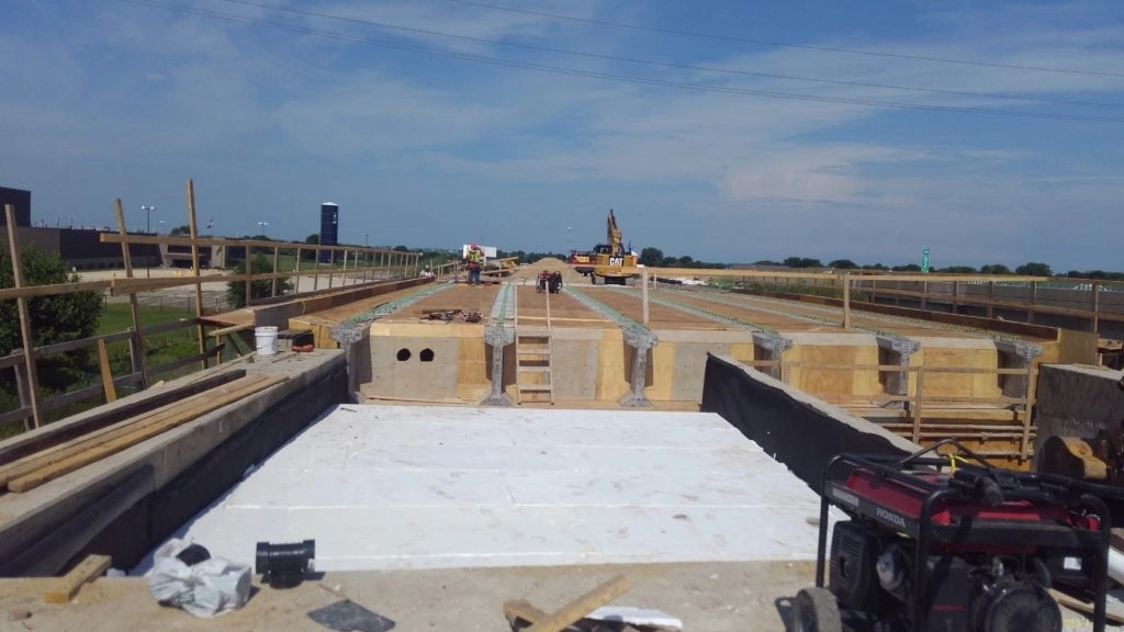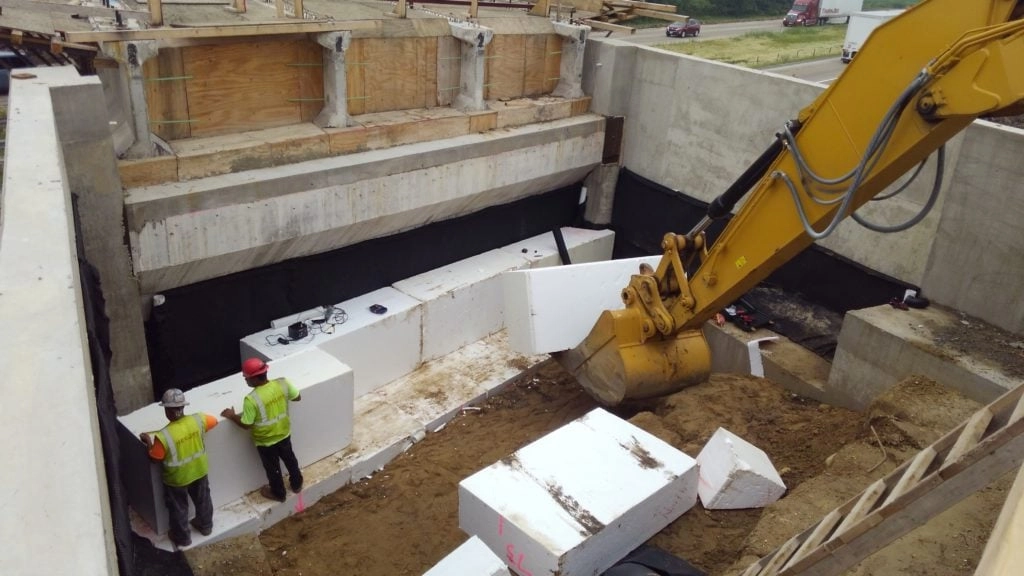 Over 600 pre-cut blocks of EPS15 geofoam were used in this bridge project on Interstate 88 over Rt. 23 in De Kalb, IL. The project design required certain areas of the bridge to be filled in with a lightweight material and EPS15 Geofoam was selected by the engineer. EPS15 weighs less than 1 lb per cubic foot and has a compression strength of 520 lbs/sf at 1% deformation. Other uses for EPS15 geofoam include highway construction, tiered seating for theaters, churches and lecture halls, void fill under raised slabs, swimming pool construction, and retaining wall back fill. EPS geofoam densities range from just under a pound per cubic foot to just under 3 lbs per cubic foot with compression strengths up to 2,680 lbs/sf at 1% deformation, making it an ideal fill for many construction projects.