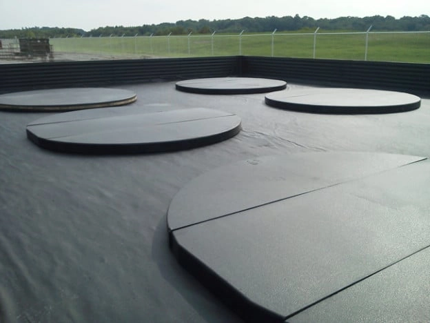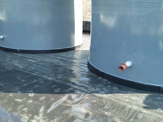 Two lb density EPS is used to create these 6″ thick pads under the steel tanks. The raised pads prevent moisture from accumulating underneath the tanks while insulating the tanks from the slab below. A polyuria coating is used to seal the EPS. The pads range in diameter from 12′ to 16′ and in thicknesses from 2″ top 8″. Universal supplies the expanded polystyrene pads precut and ready to install. The high compression strength of the 2 lb EPS easily carries the load of the full tanks.