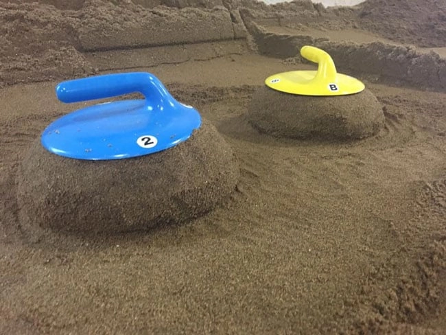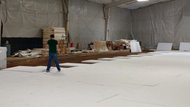 215 sheets of 1” and 150 sheets of 3” EPS were used to insulate the floor of this ice hockey rink turned curling rink in Marietta, GA. The long process started when they took over an old hockey rink. First they took out the red Georgia clay, then put sand down, then laid the .9 lb density EPS foam sheets. A vapor barrier was placed down next, then more sand. They then installed a vapor barriers, sand and chilling coils and the finished floor.
