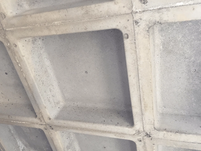 Since the .9 lb EPS has some flexibility, the forms fit snuggly between the existing grid leaving a very clean finish on the concrete after they were removed. The forms were coated on the top and sides by the contractor with Ureshell Hard Shell Foam Coating, which is a two-part polyurethane coating, so the form liners would be used multiple times. A 1” diameter hole was drilled in the center of the form so compressed air could be used to release the form from the concrete.