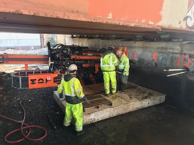EPS15. The crew was able to move the blocks by hand. Given the limited access for any support equipment this was a major factor, so they would set the drill rig on location, set up the foam blocks with the required tooling, drill to the required depth, set the reinforcing steel and grout the hole/anchors all while on the blocks. They installed 10 anchors under this bridge.