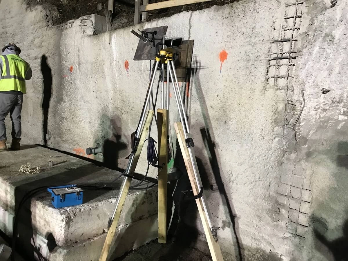On a second project, they were contracted by the MBTA to stabilize a failing retaining wall. They placed a thin layer of shotcrete on top of the existing concrete retaining wall, then drilled soil nails through the shotcrete to a depth of 20’ behind the face wall. In this picture they are testing the soil anchors by “pulling” on the thread-bar to make sure the design loads are satisfied. They used the foam blocks again as a platform for the crew to safely work off of. The jack that is behind the plate on the wall weighs about 100lbs, so not something you can lift over your head easily. The blocks allowed two workers to set the test set up at a reasonable height. Directly behind them was a live train track. Utilizing the blocks allowed them to quickly break down the platform, which had to be done 1 to 2 times per night.