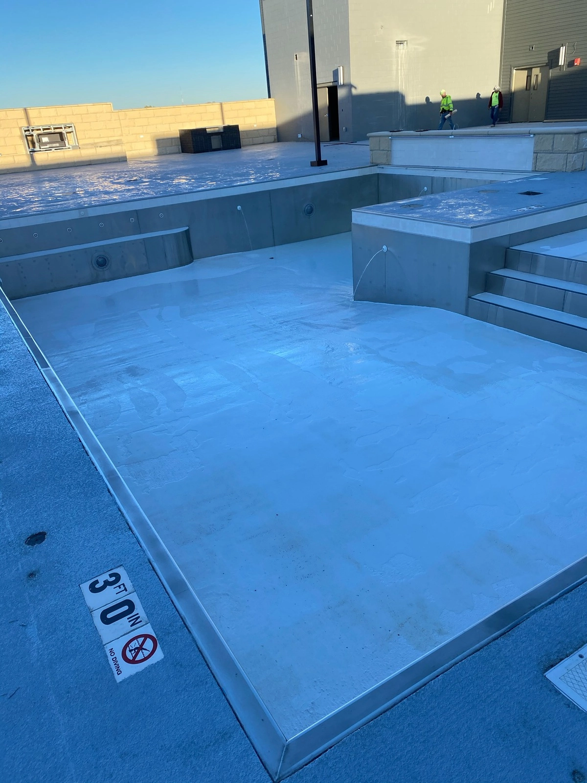 For this project in Columbus Ohio, the vault was 10’ deep. After installing EPS15 geofoam, the pool tapered from 36 inches deep at the sundeck to 60 inches deep at the deep end. EPS geofoam is used for this application because of its strength to weight ration. EPS15 geofoam, weighing just .9 pounds per cubic foot has a compression strength of 520 pounds per square foot at 1% deformation. A cubic foot of water weighs just under 63 pounds. 5 feet of water weighs under 315 pounds plus 6 inches of concrete at 75 pounds equals 390 pounds per square foot, substantially less than the 520 pound per square foot capacity of the ESP15 geofoam.