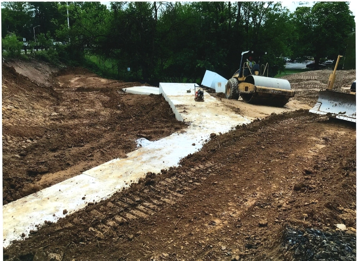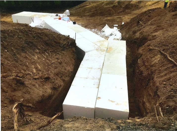 EPS Geofoam is a lightweight, rigid foam material, that is used as void fill to lighten the load on a structure. EPS Geofoam is approximately 100 times lighter than most soil, and at least 20 to 30 times lighter than other lightweight fill alternatives. This project located in Gaithersburg, MD was the redevelopment of a golf course. The contractor used large EPS19 Geofoam Blocks to lessen the weight on top of a 20” waterline pipe to avoid possible future damage.
