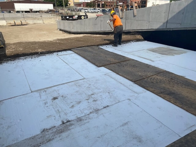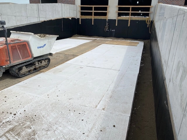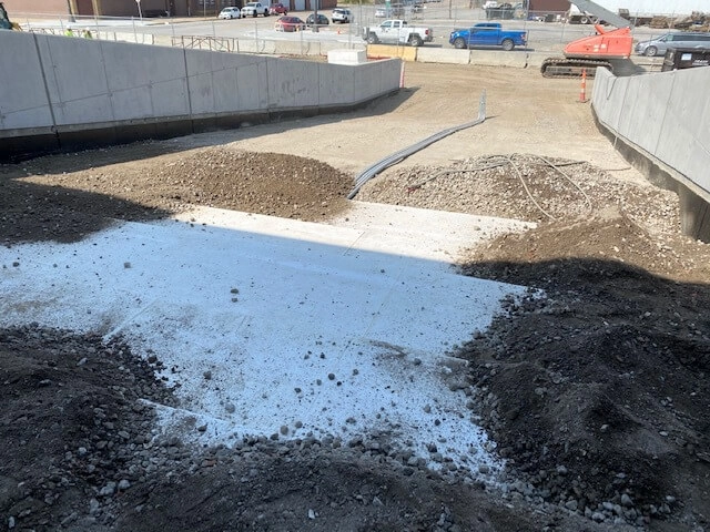EPS22 geofoam was used for the loading dock ramp for this project in Omaha, Nebraska. The contractor had used the material for interior applications and after seeing how easy it was to work with, decided to use it here also after having the engineer approve it. Universal provided a drawing showing the location of each piece of geofoam in each layer and the material was delivered to the site pre-tapered, with every piece marked for fast installation. After the geofoam was installed it was covered with earth and then concrete was placed on top.