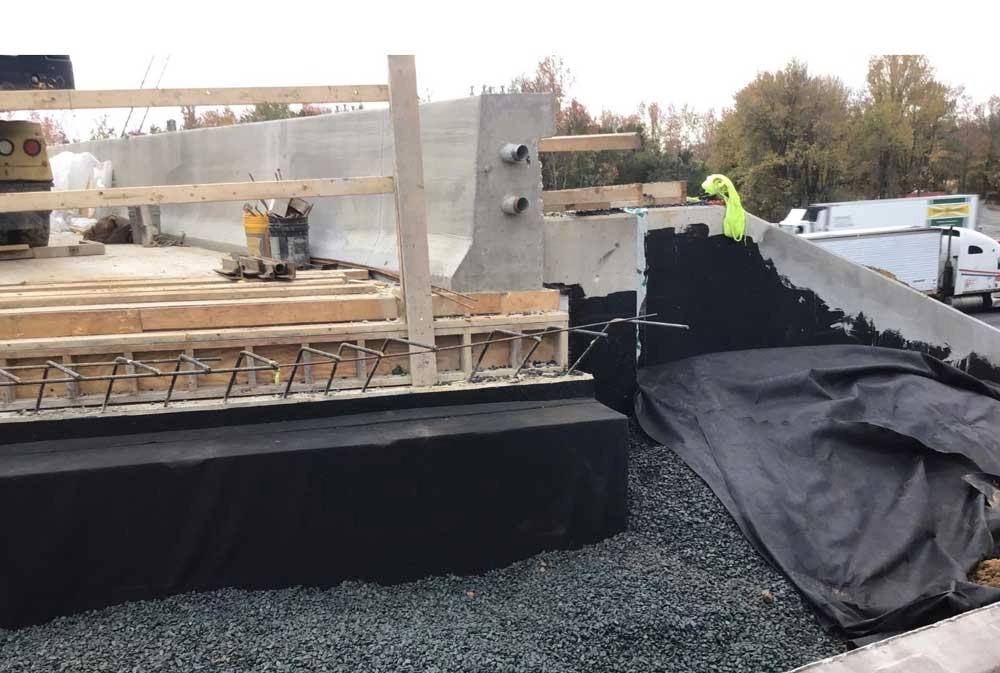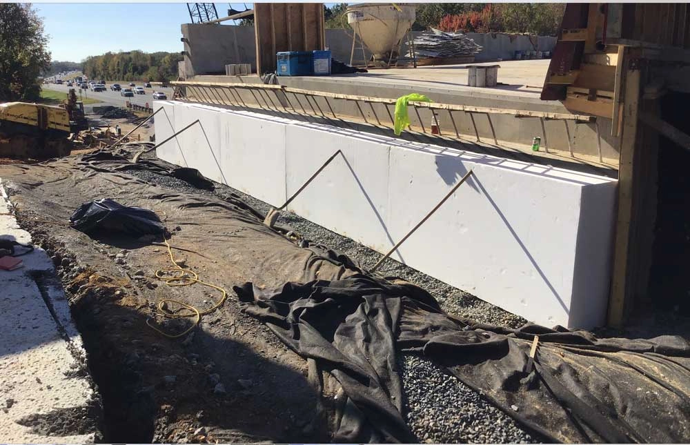 For this I-95 overpass project in Harford County, Maryland, the engineer called for 19” thick panels of EPS elastic inclusion to be placed up against the vertical face of the bridge abutment. After a geomembrane is placed over the EPS to protect it from a potential gas or oil spill, the backfill is installed and compacted prior to the paving installation. This extra step provides years of settlement free construction.