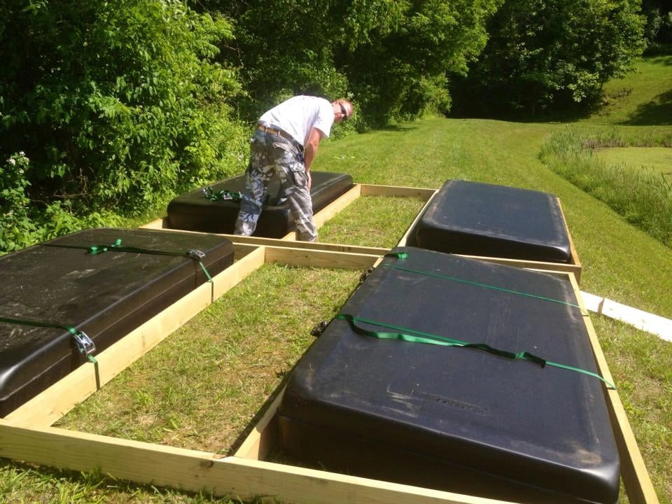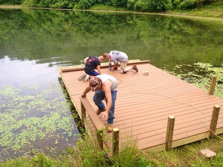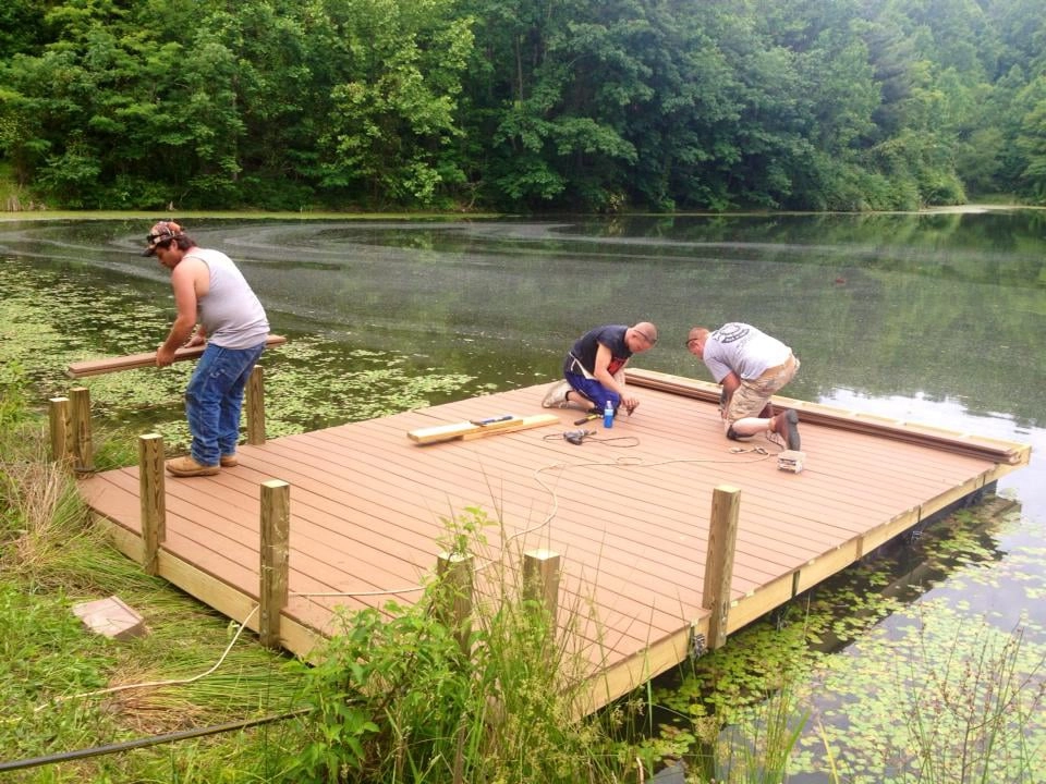 John Roman contacted Universal Foam Products when he was thinking about building a 12’ X 18’ floating dock on his private 3 acre pond. We decided to go with four of the 12” X 48” X 96” Formex Encapsulated Floats. The dock was built into two 9’ X 12’ sections and then they were bolted together. He finished the dock off with 2” X 6” composite deck boards along with some 4”X 4” deck horizontals for decoration. Everyone was happy with how the deck turned out and now they have a place to relax on the pond.