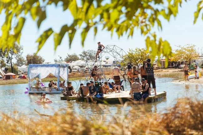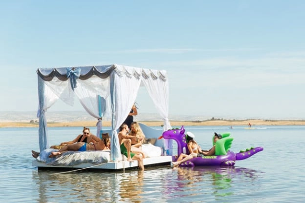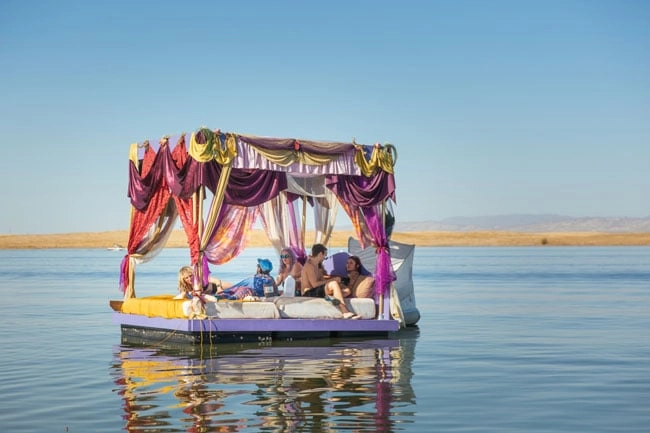 These photos show that we are only limited by your imagination. 26 blocks of .9 lb density EPS (expanded polystyrene) 24” x 48” x 48” were used to provide the flotation for floating island, bed and cabana at the Symbiosis Gathering 2016 in Emery, CA.