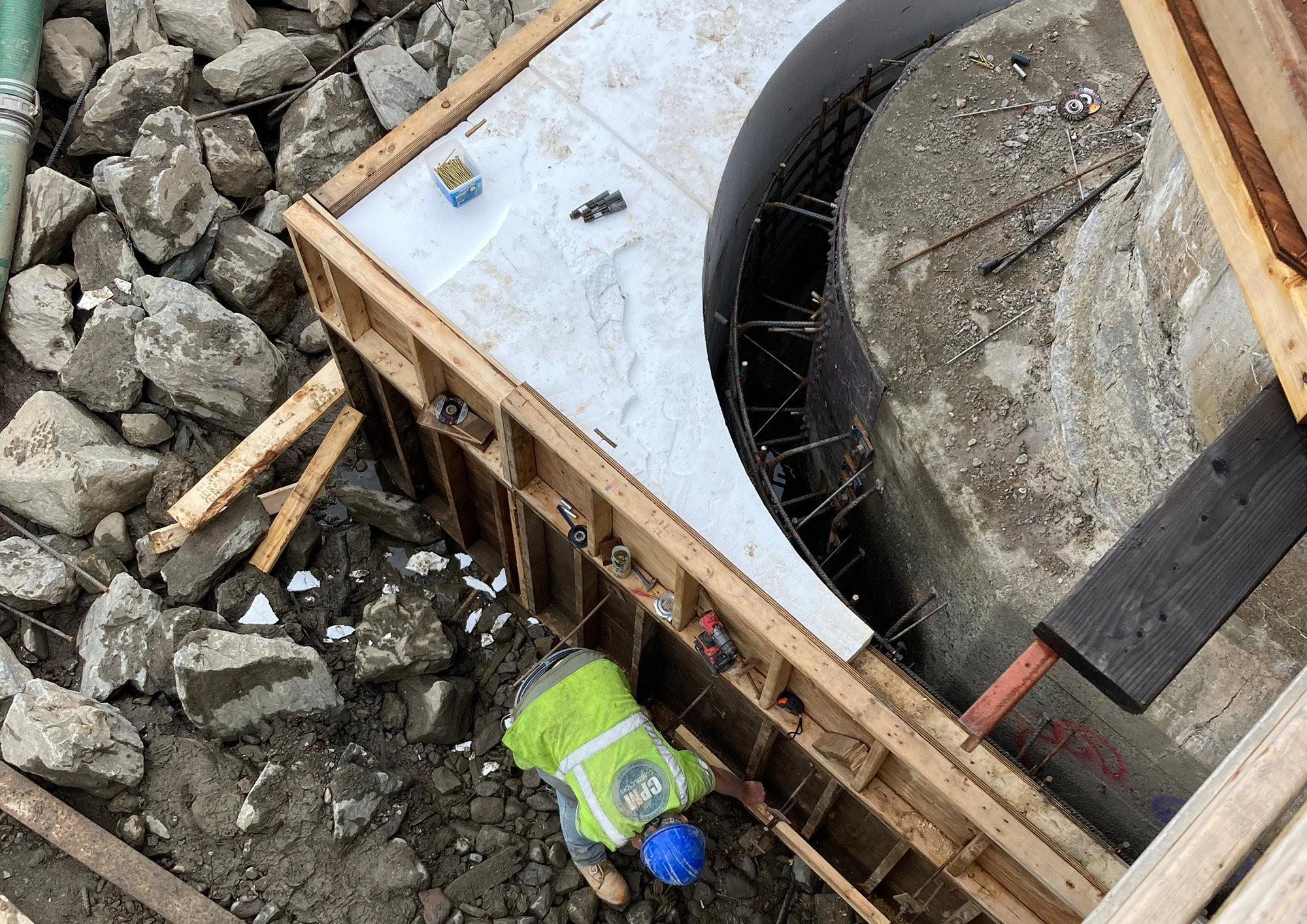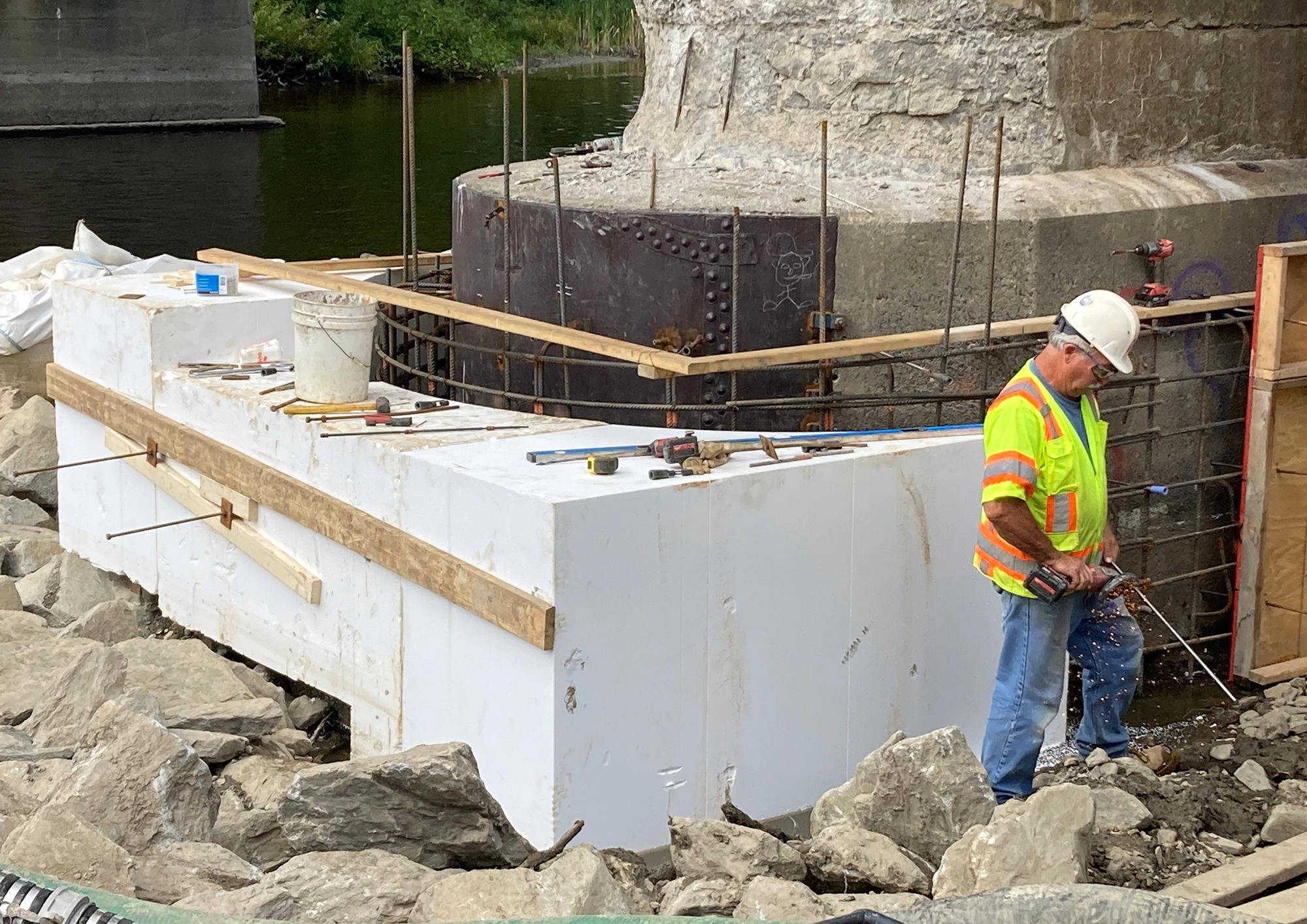 This railroad bridge located in Presque Isle, Maine went through a rehabilitation project in which Universal Foam Products helped with the expanding of the existing piers. The first step was a sandbag cofferdam around the pier to keep the work area dry, since this project was in the middle of a stream. The EPS39 Geofoam was cut to size in the factory to be used as a concrete form liner against the pier to create the shape needed for the new pour. The contractor was easily able to attach their straight forms to the foam forms provided by Universal, because of a unique patent system which was developed several years ago by Universal Foam Products. The contractor was very pleased with everything and said, “The foam fit perfectly!”
