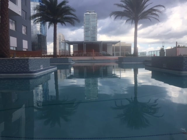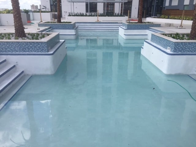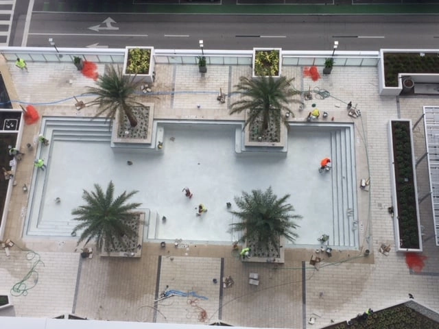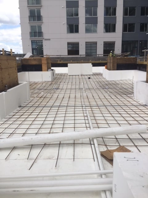 When a swimming pool contractor is asked to bid on a pool in a high-rise apartment or condominium, typically construction is more than 50% complete and the basic “tub” where the pool is to be located is already complete. The tub or vault, as it is also called is usually formed larger than the required pool and has a flat bottom. Since weight is always a consideration, the best material to use to create the final shape of the pool is EPS Geofoam. It is extremely light weight and is available custom cut to create the bottom slope speeding up construction. Steps and tanning shelves can also be provided precut. Gunite is applied directly to the EPS.