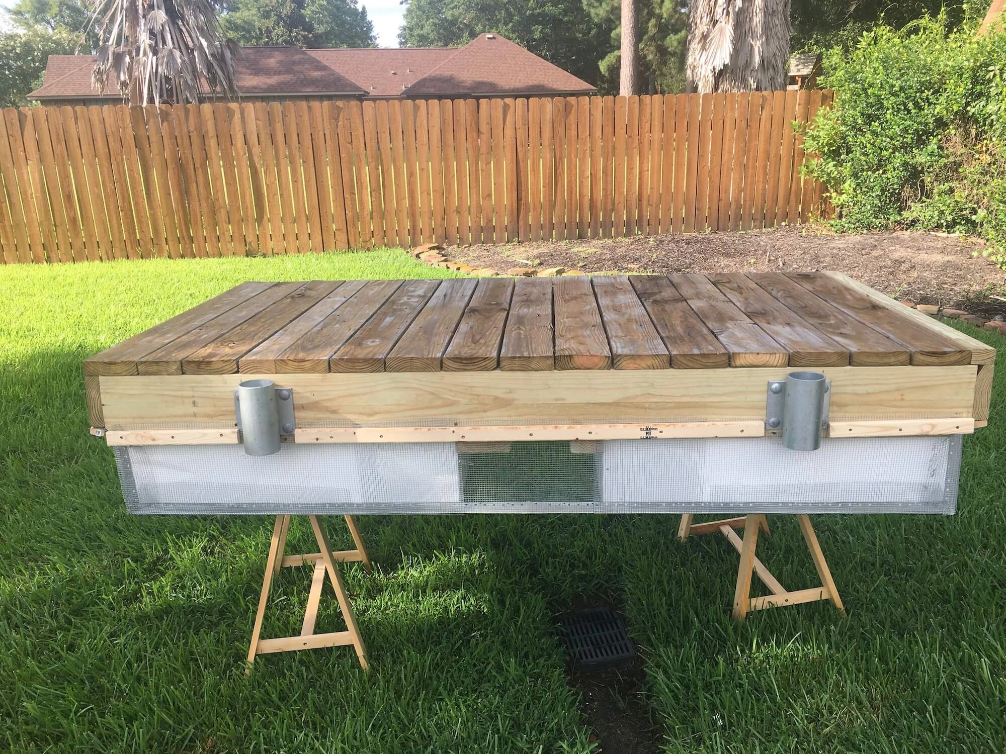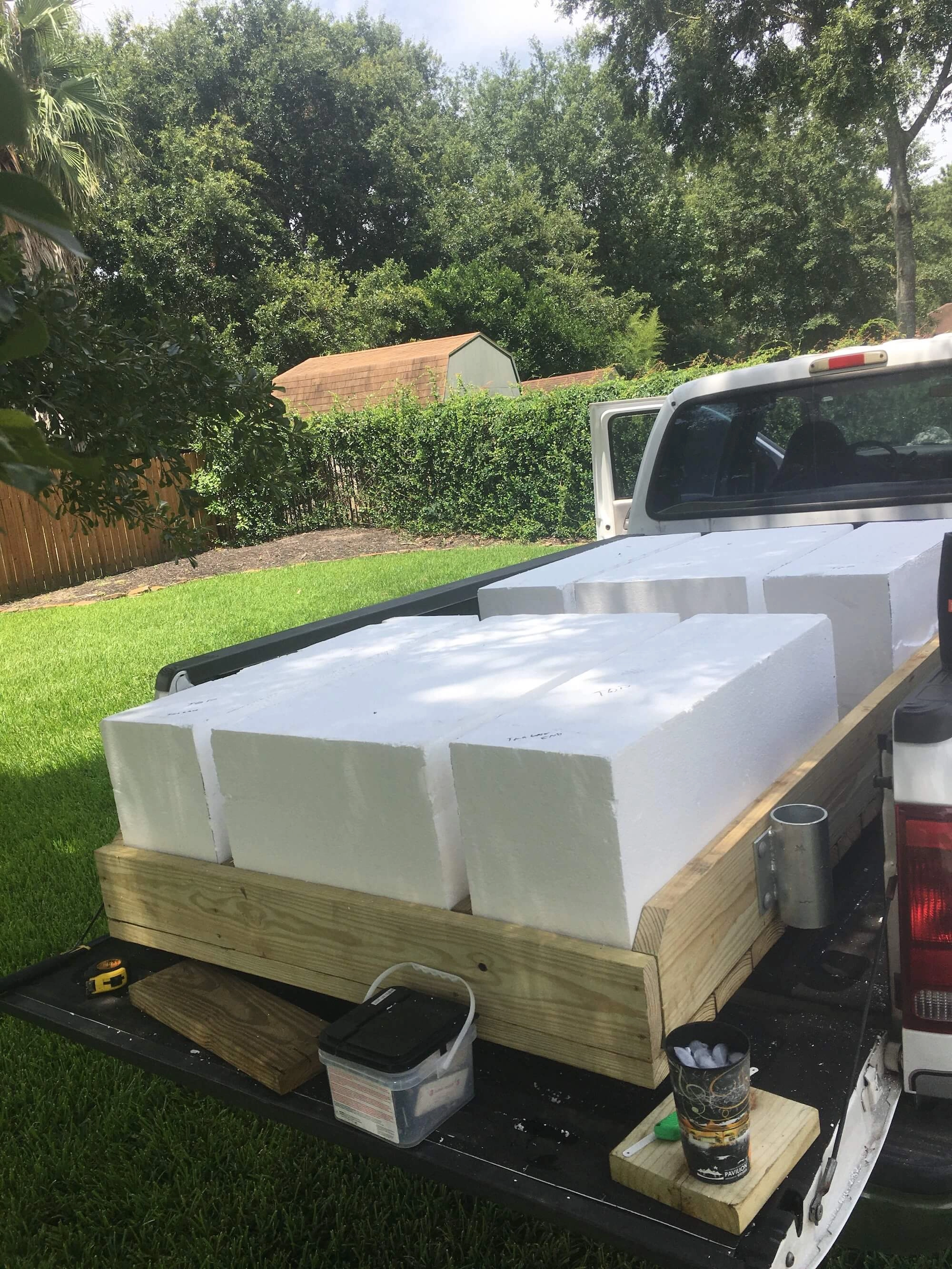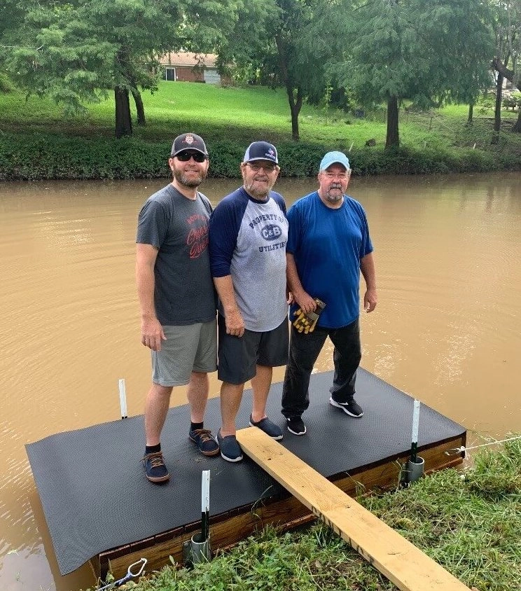 This homemade floating dock in Humble, Texas was built to last. Three blocks of 1 pound density EPS 16 inch x 36 inch x 36 inch were used for flotation. A cubic foot of EPS will float 60 pounds, so these floats will handle 720 pounds with half of the 16” height out of the water.