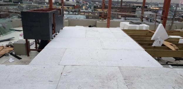 Type XV (60 psi) EPS blocks and sheets were specified for this rooftop project in Brooklyn, NY. The EPS blocks and sheets ranging from 2” thick to 12” thick were ideal for this application when compared to other fill materials such as soil, sand or stone because they are lightweight (just 3 lbs per cubic foot), incredibly strong, and very clean to work with. The EPS blocks were off-loaded at the street level and hoisted to the roof by crane. Pavers were installed directly on the EPS blocks and the lower layer of blocks were spaced creating chases for electrical conduit.