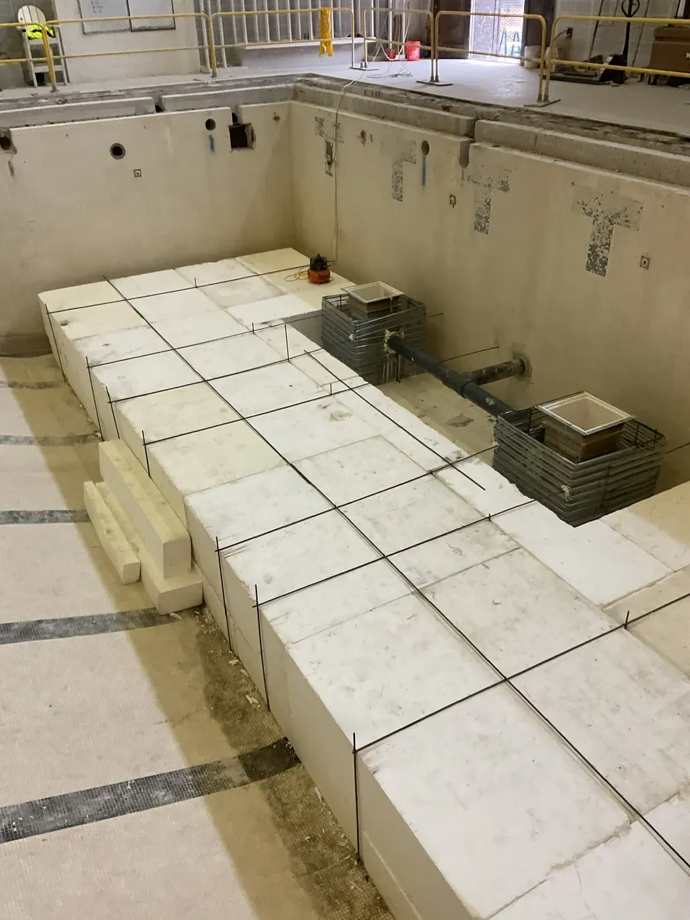 Universal Foam Products recently supplied EPS29 Geofoam for a swimming pool renovation project at Johns Hopkins University in Baltimore, MD. The renovation involved reducing the pool depth from 13 feet to 8 feet, using Geofoam blocks to fill the lower section and decrease the overall weight of the concrete infill placed above.