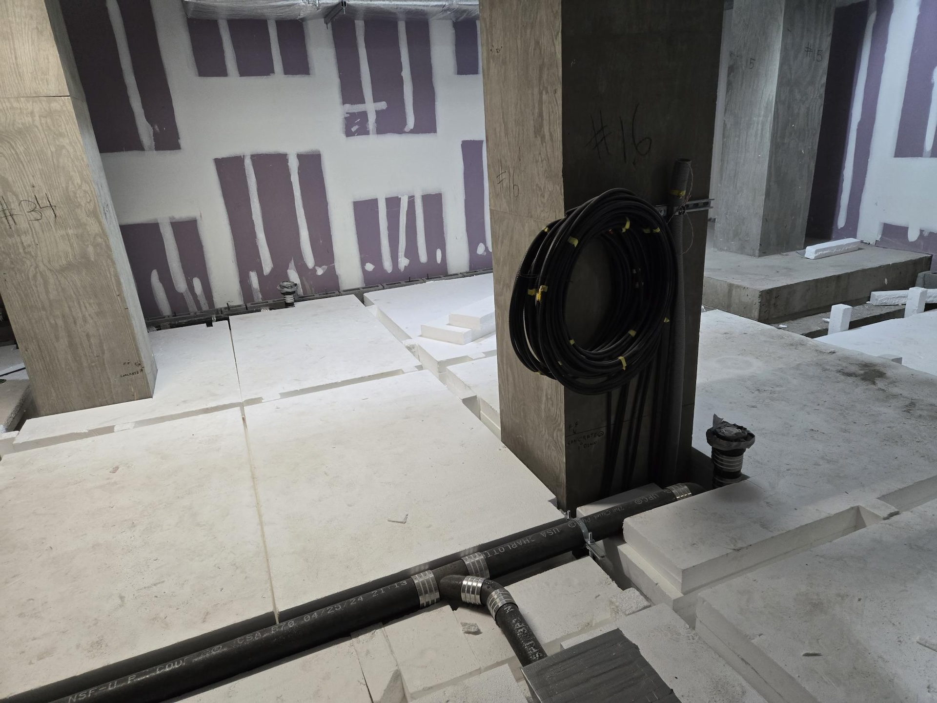 To complete the job, EPS29 Geofoam sheets of varying thicknesses were used to fill the pit, leaving space for a 4 inch reinforced concrete topping slab, which was poured over the Geofoam. Due to the presence of extensive mechanical piping within the pit, the customer used saws to cut Geofoam sheets to ensure a precise fit around the piping layout.
