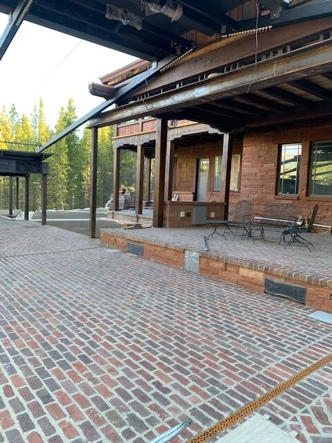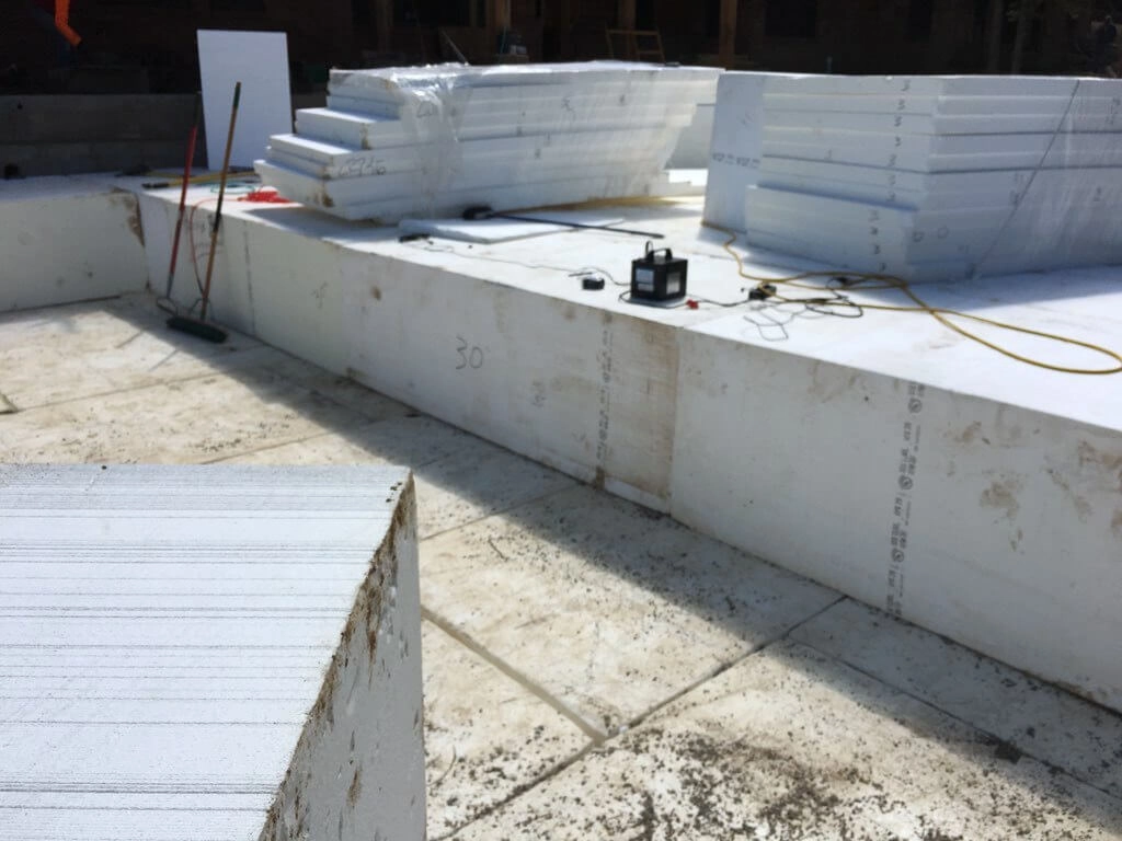 EPS29 geofoam in 4 foot x 8 foot blocks of varying thicknesses were used to fill a 40’ x 80’ patio area. The EPS 29 geofoam has a compression strength of 1,570 pounds per square foot (10.6 psi) at 1% deformation. The largest blocks measuring 3’ x 4’ x 8’ weighed just 173 pounds making them easily manageable with 2 people. After the 4 layers of geofoam were set in place a 4” concrete slab was installed.