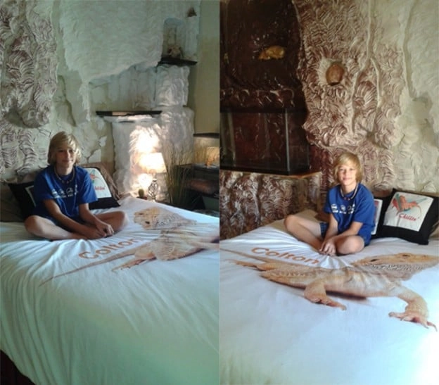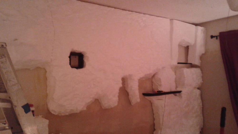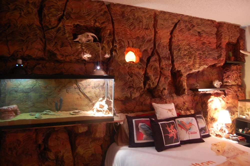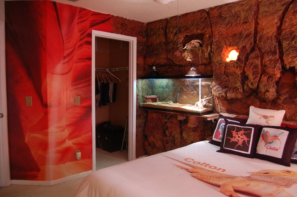 Using 2 blocks of 1 lb Virgin EPS 7” x 48” x 120” this mother from Lutz, Florida created this wall in the sons bedroom. The inspiration behind this room was the son’s love and fascination with his bearded dragon, Rango. The mother decided to make his room look like the inside of terrarium. Although her son didn’t get to help with the carving for the wall, as it was a Christmas surprise for him, they have stryofoam that he will help carve for each of his lizards’ cages.