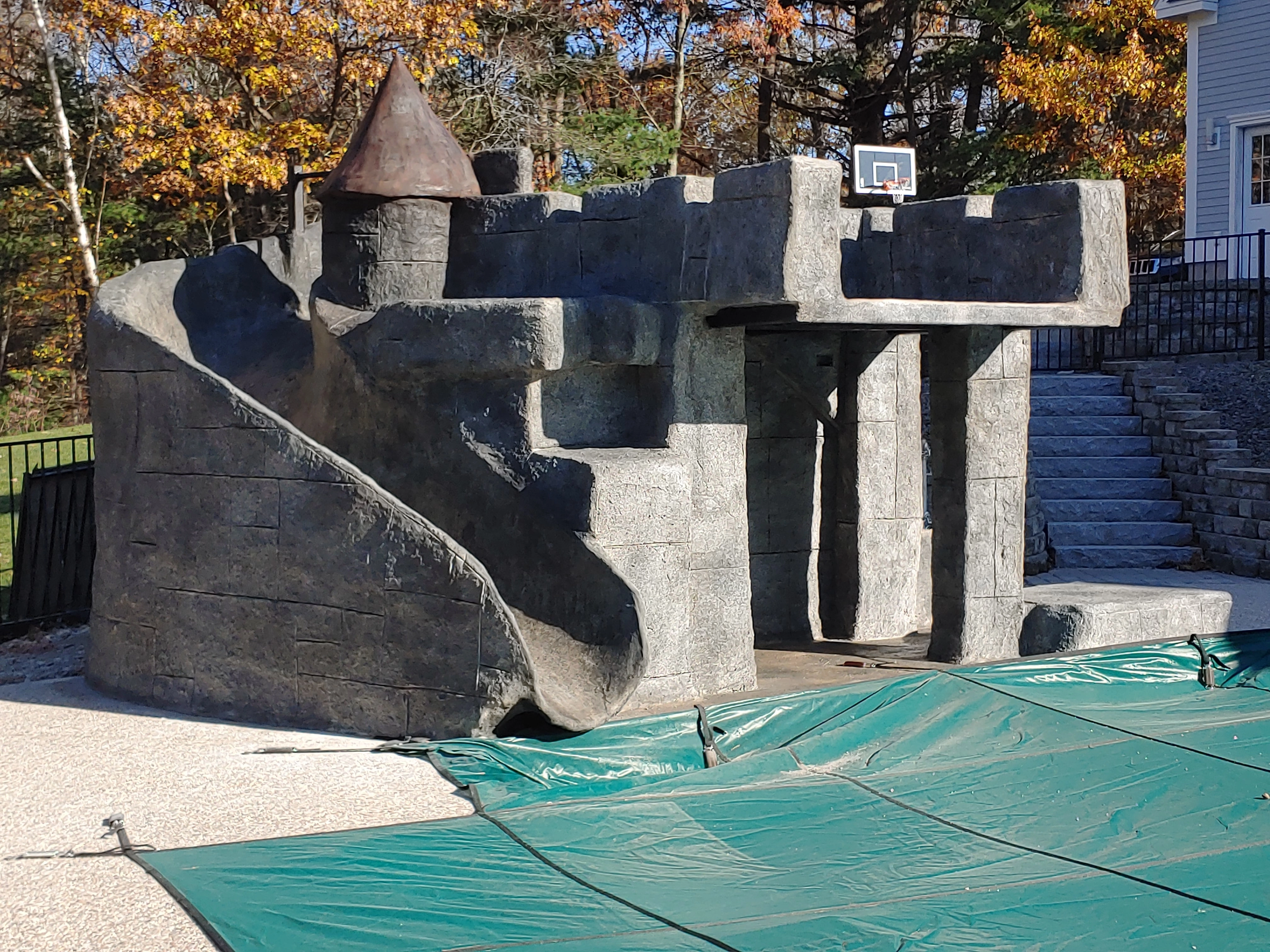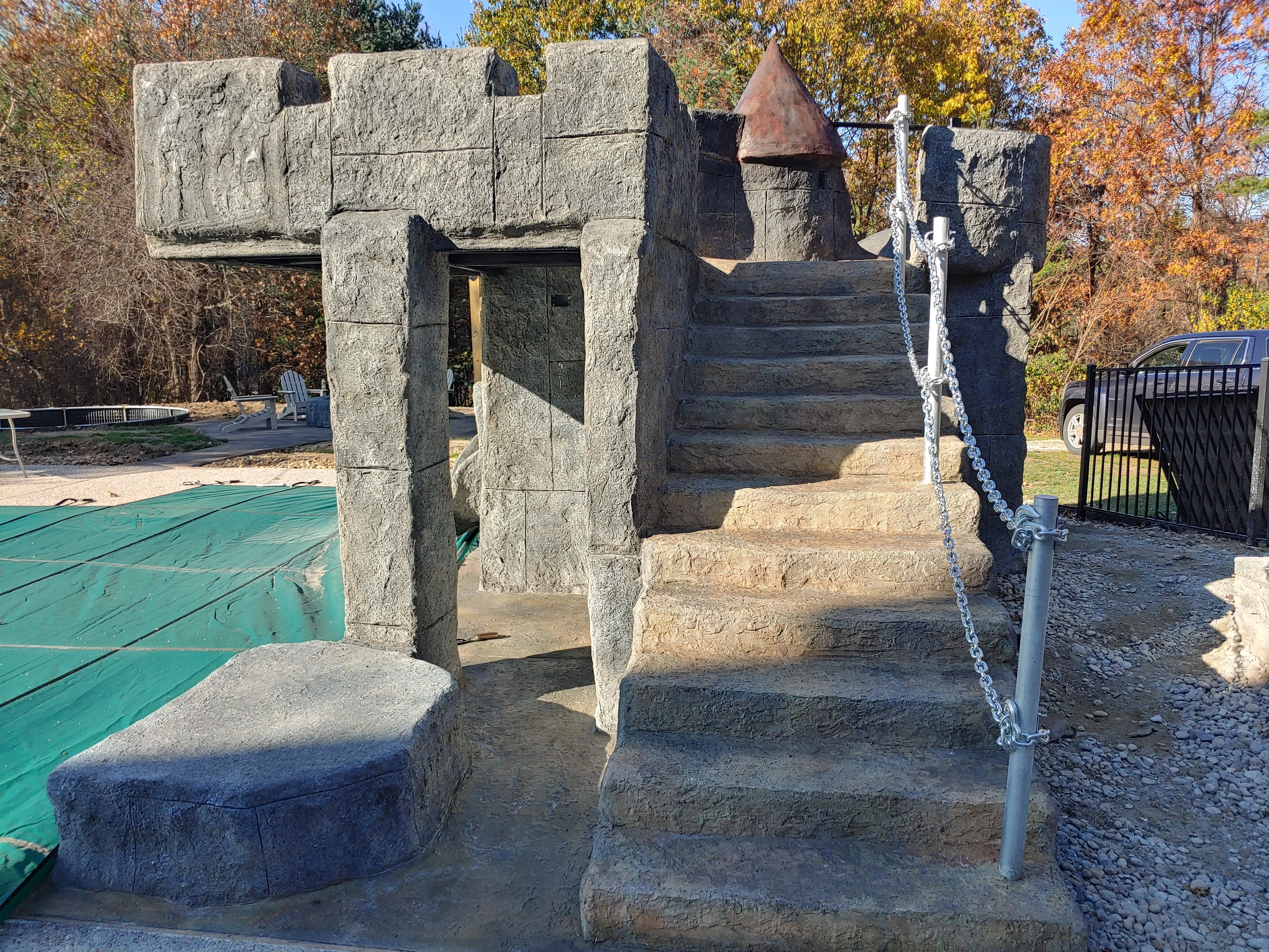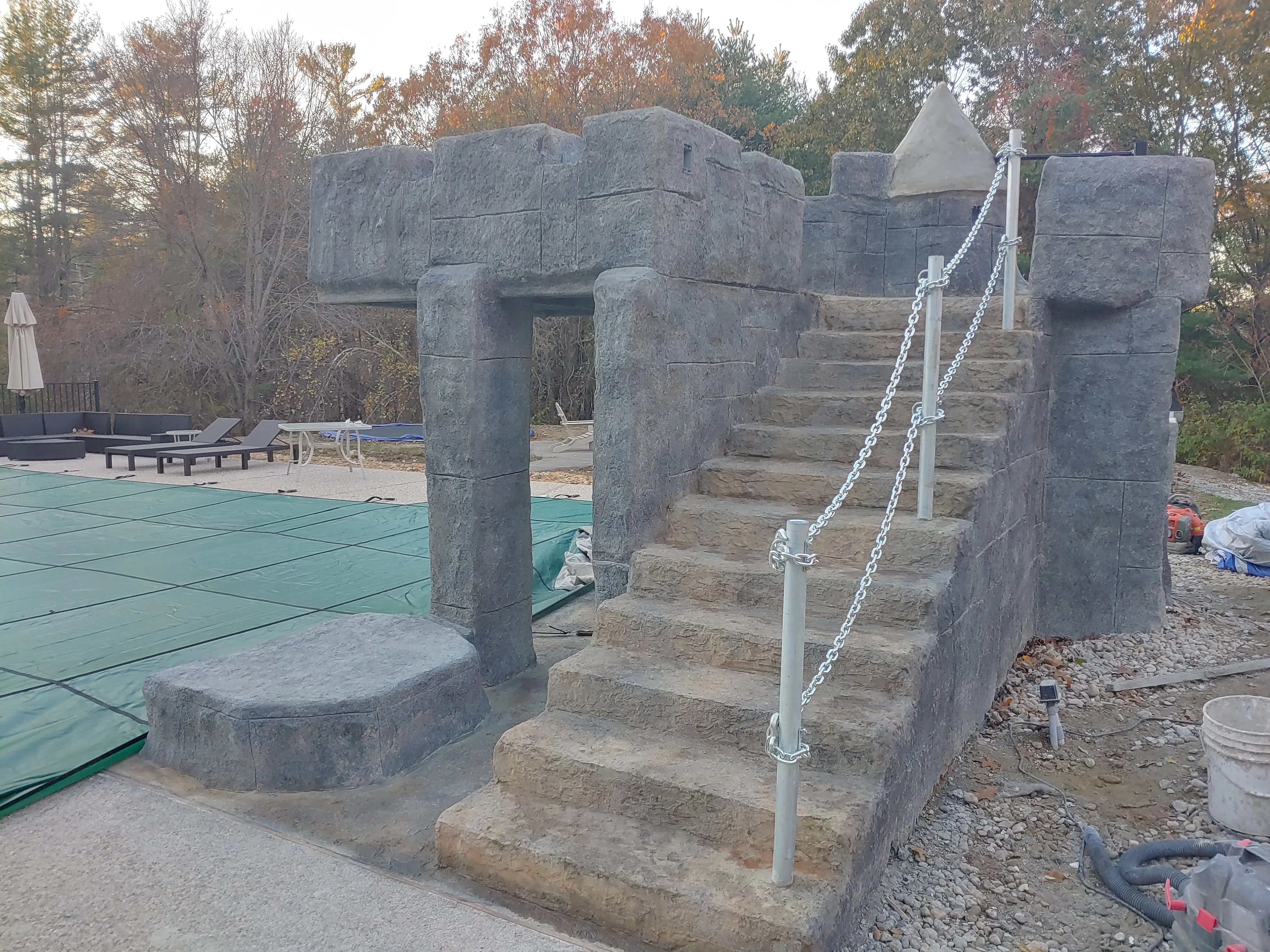 This amazing castle-like structure in Brentwood, New Hampshire was constructed using blocks of .9 lb density recycled EPS, steel rebar, wire mesh and a structure coating. The creative sculpture has multiple raised platforms to enter the pool from along with a water slide. The blocks for the stairs were precut at the factory and the balance was finalized on site from several different size EPS blocks.