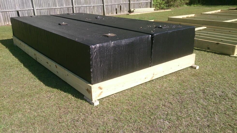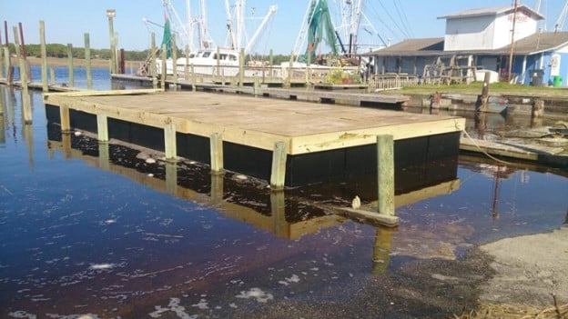 Un-encapsulated EPS blocks are not only used for residential floating docks. They are also used for commercial work barges. This particular barge was constructed for a large scale oyster planting operation in North Carolina. Four separate work barges were constructed 16′ wide x 32′ long using 16 blocks of .9 lb density EPS 24”x 45” x 192”. They were then tied together to create a 32′ x 64′ platform. The EPS is covered with Mirafi®, a nonwoven geotextile, to protect the EPS from barnacle and other underwater growth. This allows the owner to brush any growth off the Mirafi® without any damage to the EPS. The barge is loaded up with oysters and towed to the planting areas where they are deposited and allowed to mature. Each section will hold 15 cubic yards of oysters.