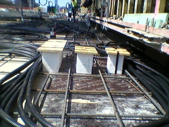 Careful planning for vertical chases in the construction of a high-rise building can save thousands of dollars in rework later in the project. For this 50-story high-rise in Morrisville, PA the contractor carefully laid out the location of vertical penetrations on each floor and used .9 lb density EPS of various sizes to create the block-outs. All the block outs were the same thickness as the slab that was to be poured and they were all secured in place using strapping. The EPS was delivered to the site, several floors at a time, labeled per the contractor’s instructions. After the concrete set up and the forms were removed the EPS block-outs were easily punched out.